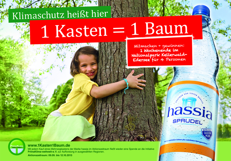 Zwischen dem 9. September und 12. Oktober 2013 fließt beim Kauf eines hassia Mehrweg-Aktionsprodukts wieder eine Spende an PrimaKlima -weltweit- e.V. „Diese Initiative, mit der wir seit 2008 kooperieren, setzt sich für den Klimaschutz durch Aufforstung ein“, erklärt Daniel Krämling, Markenmanager hassia. „Seitdem haben Endverbraucher bei unserer Aktion 1 Kasten = 1 Baum dazu beigetragen, dass weltweit auf einer Fläche von etwa 1.100 Fußballfeldern neuer Wald heranwächst.“ Das verringert die Umweltbelastung durch CO2 Jahr für Jahr um 5.600 Tonnen.