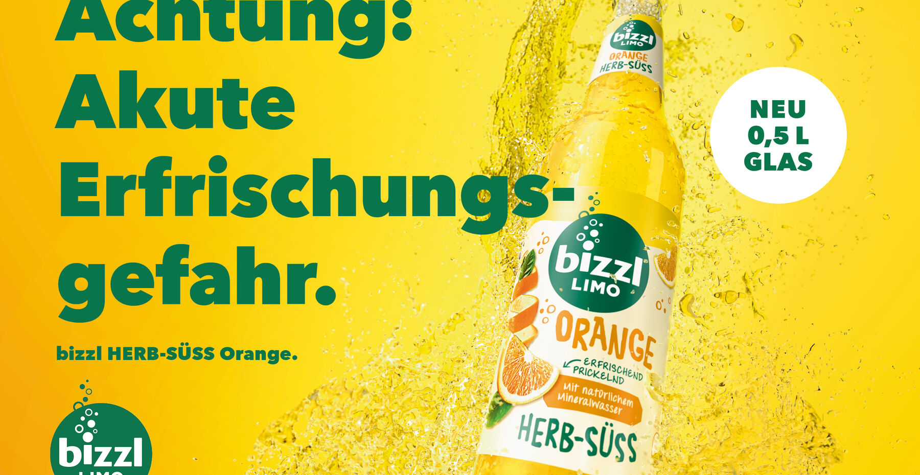 Die neuen 0,5 L HERB-SÜSS Glasprodukte stehen im Mittelpunkt der Kampagne. Die beiden Limonaden zeigen sich in erfrischenden ungesehenen Perspektiven. Die Bildsprache ist aufmerksamkeitsstark und die Headlines überraschend. Mit dieser maximal erfrischenden Produktinszenierung sorgen bizzl HERB-SÜSS Zitrone und Orange für „eine Poolparty der Synapsen“ oder bringen die „Schmetterlinge auf der Zunge“ zurück.