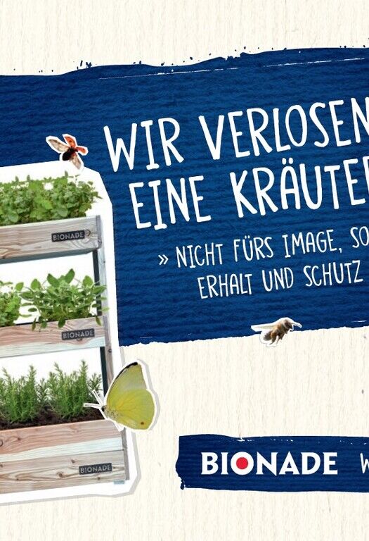Das geht zum Beispiel mit den hochwertigen Kräutertreppen von BIONADE, die im Aktionszeitraum von Februar bis April bei den beteiligten Handelspartnern als Instore-Gewinn unter den Teilnehmenden verlost werden. Die Gesamtblühfläche beträgt insgesamt einen Quadratmeter – und jeder davon zählt. Die Aktion zahlt so auf das Ziel der Initiative „Vielfalt 2030“ ein, bis zum Jahr 2030 mindestens 17 Millionen Quadratmetern Grünfläche insektenfreundlicher zu gestalten.
