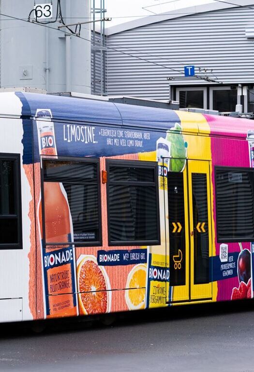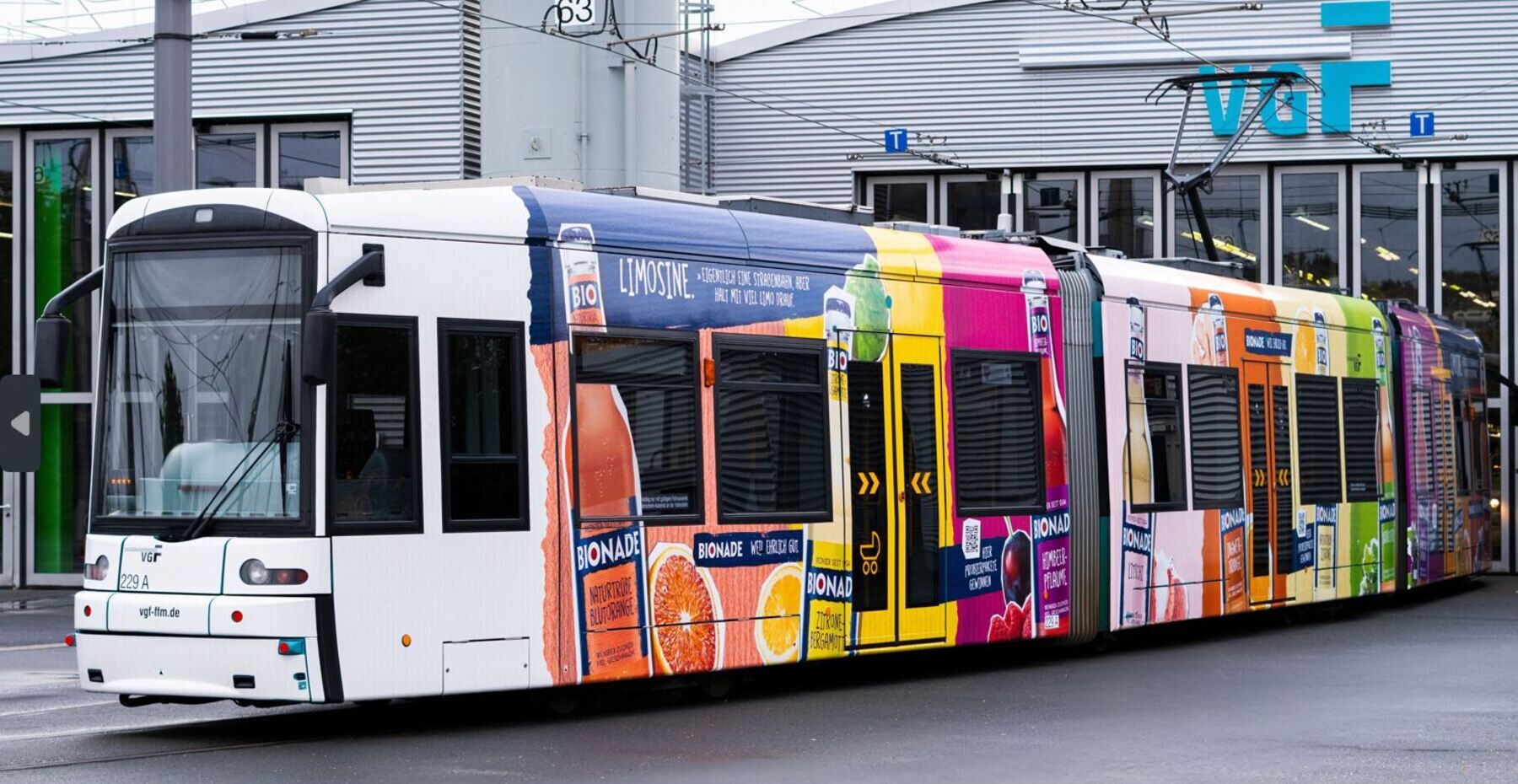 Die BIONADE Limo-Vielfalt macht vor dem öffentlichen Nahverkehr nicht Halt: Das Frankfurter und Kölner Stadtgebiet gestaltet der Bio-Ponier mit Straßenbahnen im Markendesign jetzt noch ein bisschen bunter.