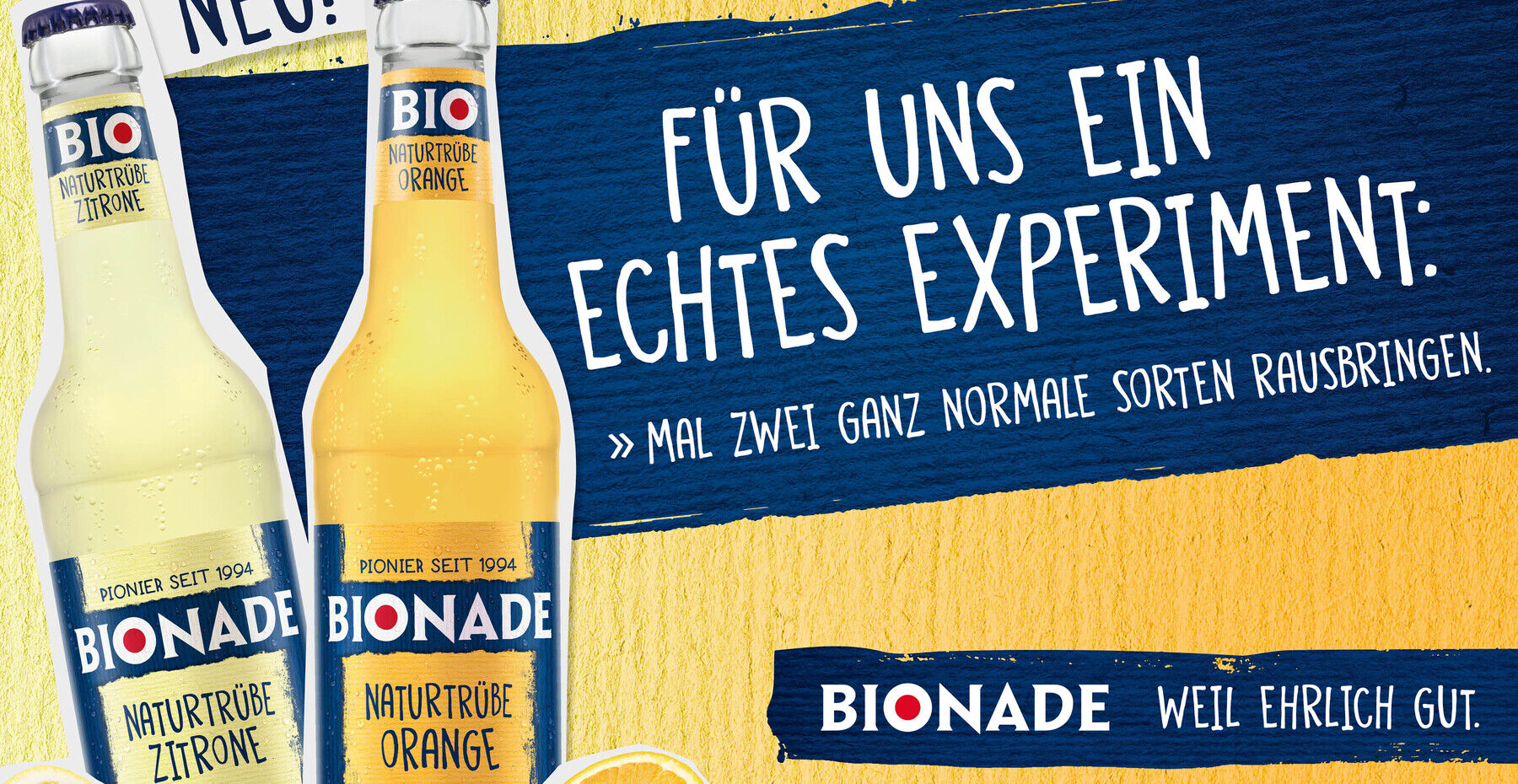 „Wir werben direkt vorm Supermarkt. Schlau, oder?“ gesteht BIONADE ein. Oder auch „Für uns ein echtes Experiment. Mal zwei ganz normale Sorten rausbringen.“ plakatiert BIONADE für die beiden neuen klassischen Sorten Naturtrübe Orange und Naturtrübe Zitrone. Genauso wie „Schon immer wenig Zucker. Aber plötzlich feiern es alle“.