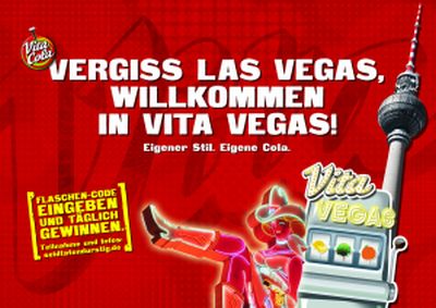 Schmalkalden/Lichtenau, März 2012. Mit ihrer diesjährigen Consumer Promotion lockt die Marke VITA COLA ihre Fans unter dem Motto „Vergiss Las Vegas, willkommen in VITA VEGAS!“ ins Online-Casino. Der Weg dahin ist erfrischend kurz, der Zutritt denkbar einfach: Die Etiketten der 1,0 l PET-Mehrwegflaschen von VITA COLA Original, VITA COLA Original Zuckerfrei, VITA COLA Pur und den drei Limonaden der VITA COLA-Familie enthalten im Aktionszeitraum April jeweils einen Glücks-Code. Mit diesem kann man auf der VITA COLA Aktions-Microsite www.seidtatendurstig.de ein Spiel am einarmigen Banditen wagen. Den ganzen Monat lang gewinnt der jeweils Tagesbeste eine Sony PlayStation VITA. Unter allen Teilnehmern wird zum Schluss eine Woche für 2 in Berlin inklusive Casinobesuch und 1.000 Euro Spielgeld verlost.