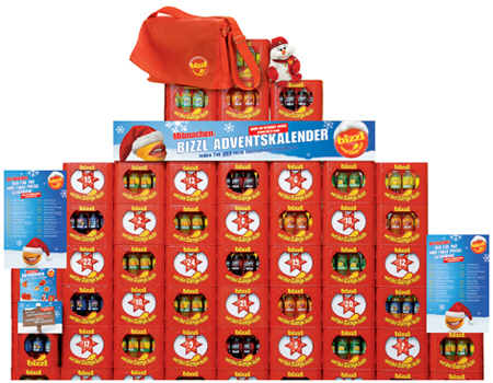 Der bizzl Adventskalender ist durch die außergewöhnliche Größe ein Top-Blickfang in jedem Getränkemarkt. Der rote Kasten assoziiert sofort eine weihnachtliche Stimmung und löst beim Verbraucher als Adventskalender aufgebaut eine hohe Signalwirkung aus.