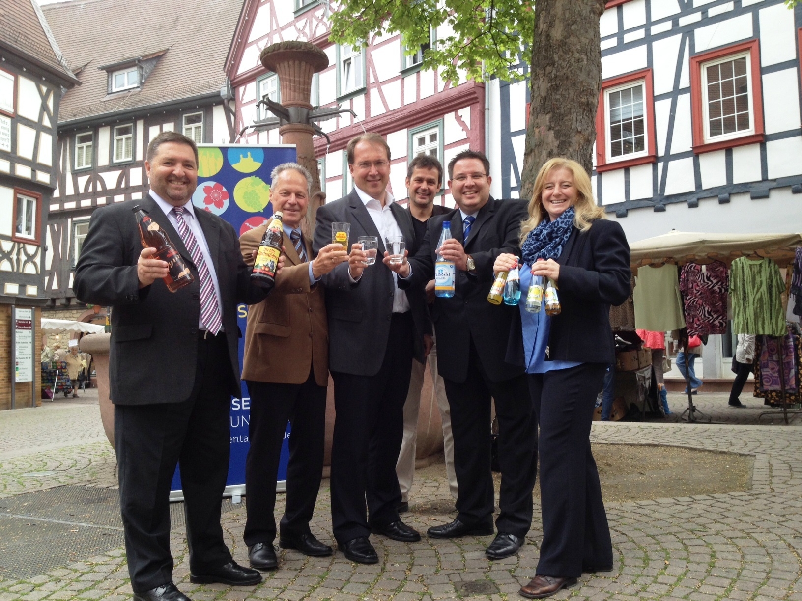 (v.l.n.r.): Reinhold Obertshauser und Harald Markraf von Rapps freuen sich mit Bensheims Bürgermeister Thorsten Herrmann und dem Hessentagsbeauftragten Thomas Herborn sowie Michael Seufert und Gaby Wolf von Hassia auf einen erfolgreichen Hessentag 2014!