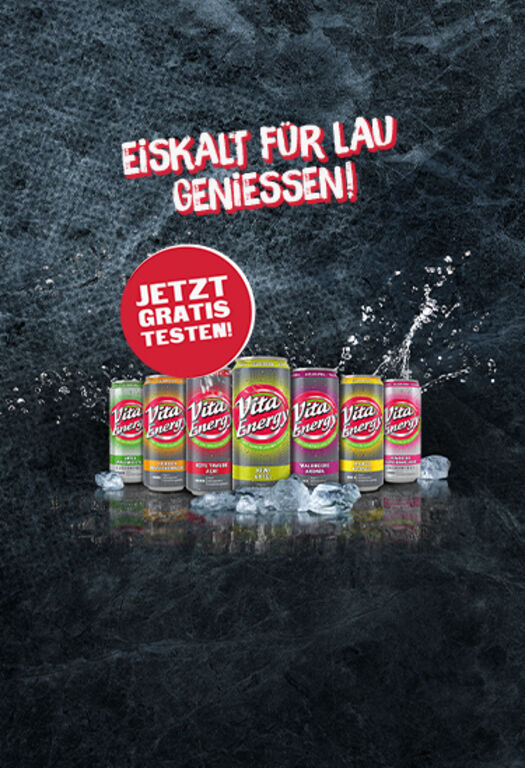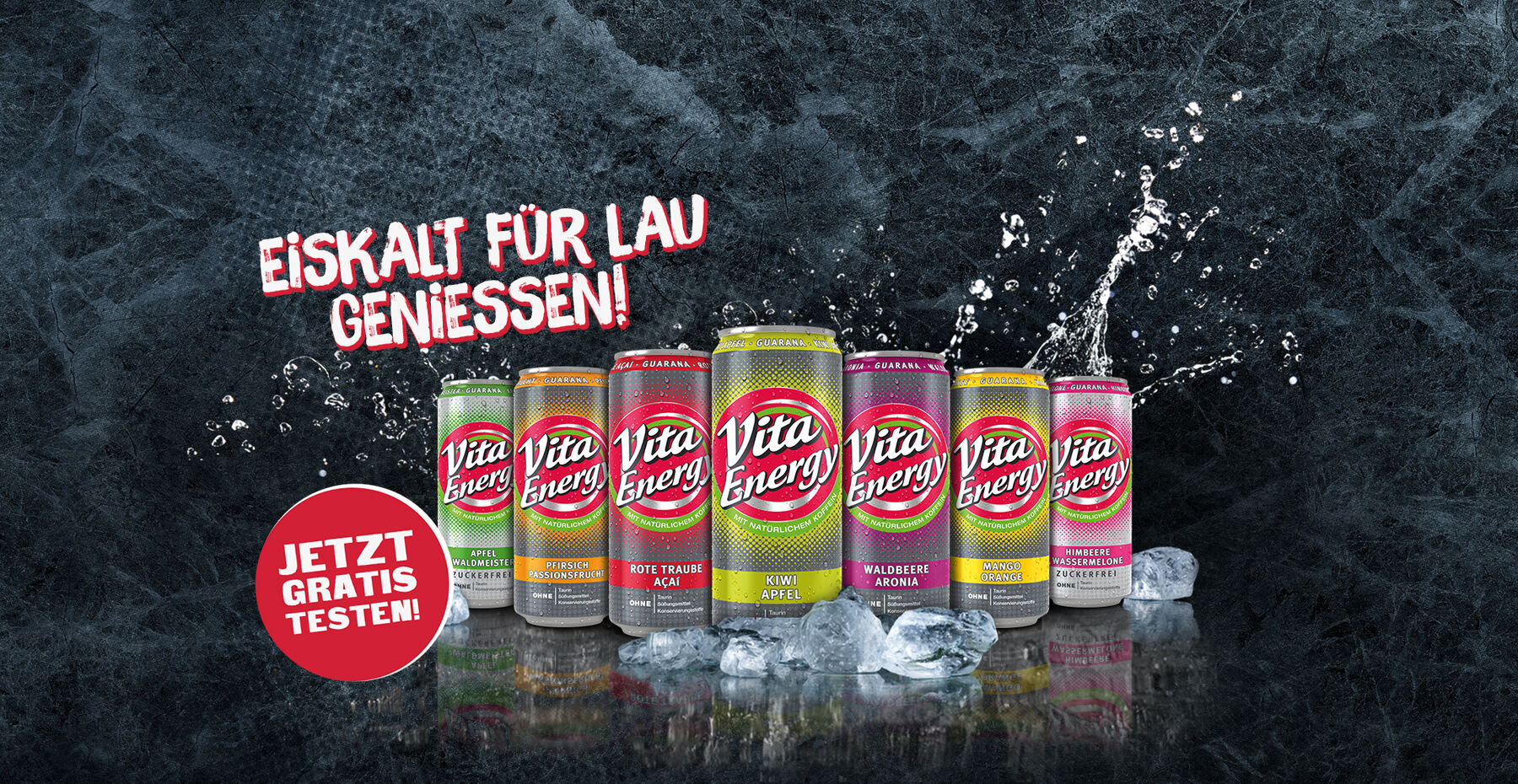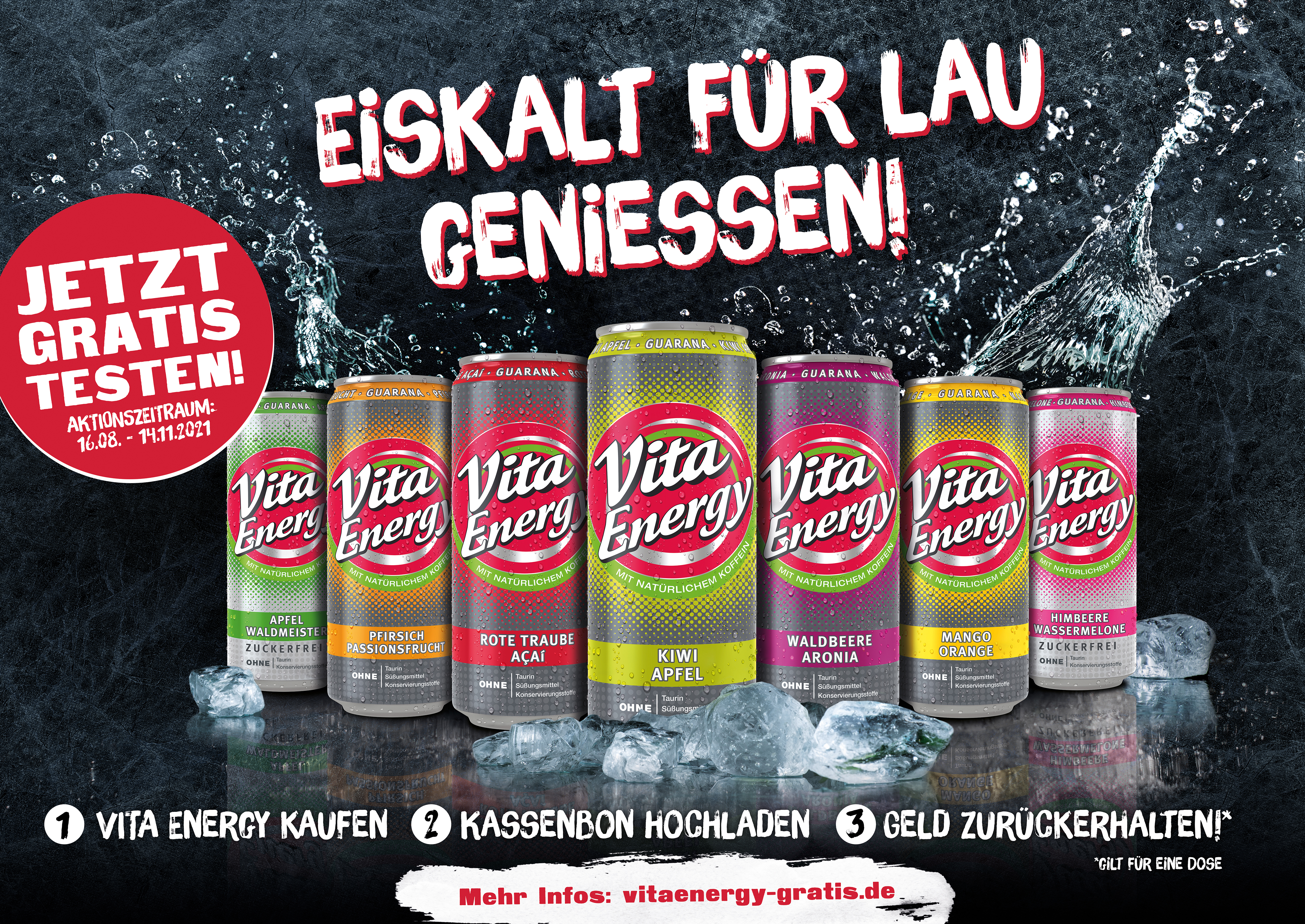 Zwischen Mitte August und Mitte November kann man sich kostenfrei davon überzeugen, wie fruchtig-frisch die von Natur aus energiegeladenen – am besten gut gekühlten – Drinks schmecken. Unter dem Motto „Eiskalt für lau genießen“ lädt VITA ENERGY zur Gratis-Testen-Aktion ein. Dafür muss man nur einen VITA ENERGY Drink kaufen und den Bon auf www.vitaenergy-gratis.de hochladen. Pro Teilnehmer wird dann das Geld für eine Probedose erstattet. Zur Wahl stehen die fünf klassischen Sorten Waldbeere Aronia, Pfirsich Passionsfrucht, Rote Traube Açaí, Mango Orange und Kiwi Apfel sowie die beiden zuckerfreien Sorten Himbeere Wassermelone und Apfel Waldmeister.