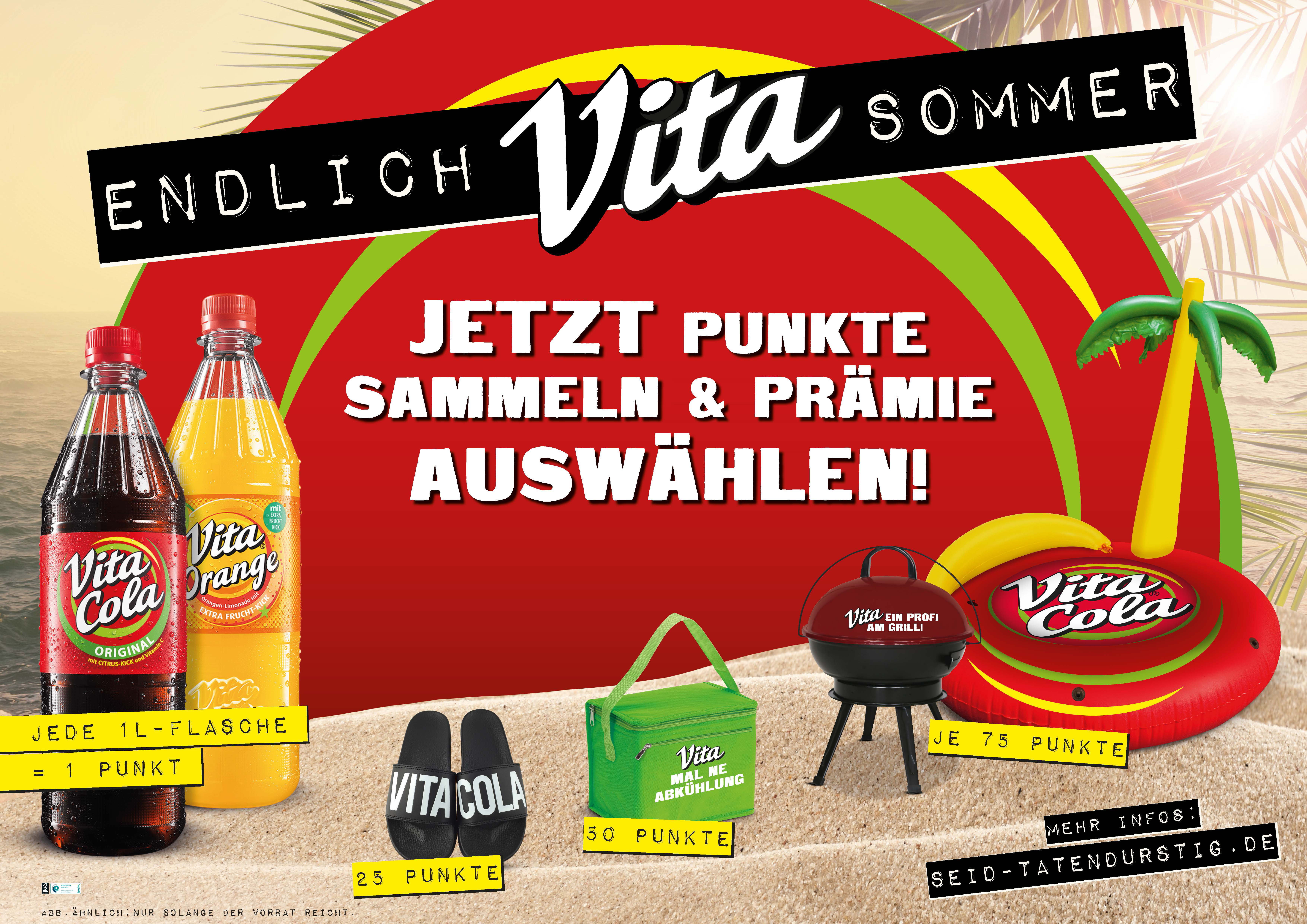 „Endlich VITA Sommer!“ wird im Aktionszeitraum auf den Etiketten von insgesamt 6,2 Millionen Flaschen beworben, begleitet von einem Media Flight in KW16/17, bestehend aus Großflächenplakaten, Megalights, Infoscreens, Funkspots sowie zielgruppenspezifischer Online- und Social Media-Werbung.