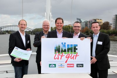 11. Oktober 2011 – Mit einem Familienausflug auf dem Main steuerte die Initiative „Nähe ist gut“ den Abschluss ihrer jüngsten Aktion an. In Frankfurt trafen sich am letzten Samstag zwanzig Gewinner der 4. Aktion „Nähe ist FÜR DEN URLAUB gut“ mit ihren Kindern, Geschwistern oder Großeltern zur Mainrundfahrt mit der Primus Linie. Unter den Gästen an Bord war auch Ernst Krepinsky, der Leiter des Mutter-Kind-Hauses der Stiftung Waisenhaus Frankfurt am Main: Die Geschäftsführer der Partnerunternehmen Rainer Noll (Licher), Ullrich Schweitzer (Hassia) und Günter Berz-List (Schwälbchen) sowie Michael Tokarsky, Einkaufsleiter ReweGruppe von „Nähe ist gut“ überreichten ihm einen Spendenscheck in Höhe von 2.000 Euro.