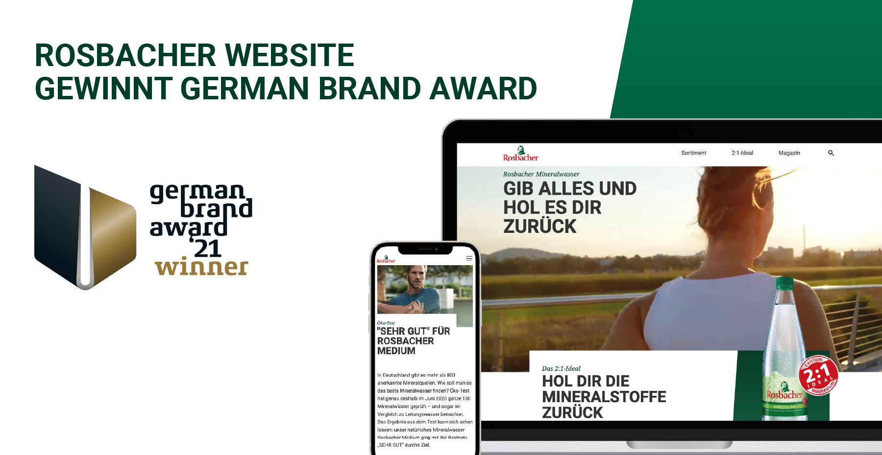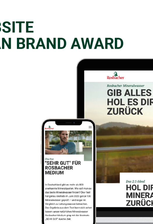 – Die Webpräsenz der Mineralwassermarke Rosbacher erhielt einen German Brand Award in der Kategorie „Excellence in Brand Strategy and Creation – Brand Communication – Web & Mobile“. Den Preis nahm die huth + wenzel werbeagentur gestern bei der „German Brand Convention“ online entgegen. Die Frankfurter Digitalagentur konzipierte und gestaltete 2020 die Website der Marke von Grund auf neu: Durch den Relaunch entwickelte sich www.rosbacher.de von einer Produkthomepage zu einer modernen, Content-intensiven Seite. Unter dem Slogan „Gib alles und hol es dir zurück“ bietet u.a. ein umfangreiches Magazin zahlreiche informative Artikel rund um Getränke, Sport und eine gesunde Ernährung. Der Erfolg: Seit dem Relaunch im Herbst 2020 hat sich die Verweildauer der Besucher deutlich erhöht.
