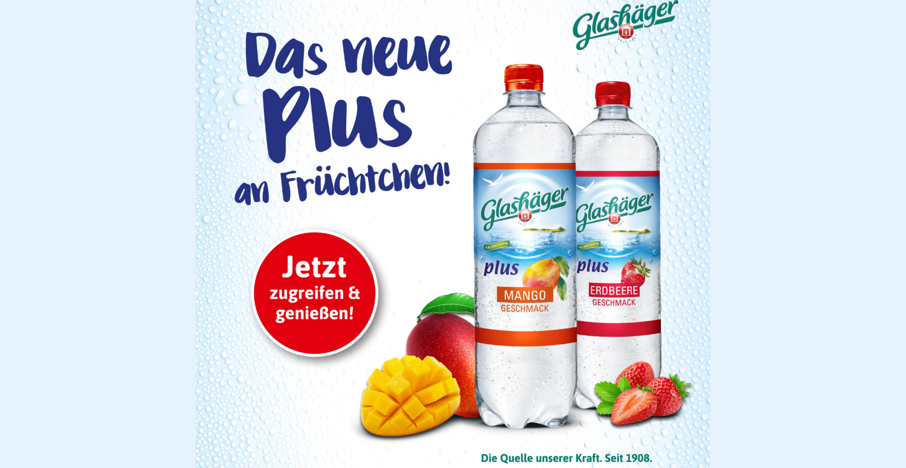 Glashäger bringt den Geschmack des Sommers in die Getränkeregale: Die beliebte Flavoured-Water-Range Glashäger Plus ist seit April in den neuen Geschmacksrichtungen Erdbeere und Mango erhältlich. Die fruchtigen Durstlöscher vergrößern das bestehende Sortiment aus Kirsche, Himbeer und Pfirsich. Angeboten im praktischen 1,0 Liter PET-Einweggebinde für den Unterwegskonsum sowie als handlicher Sechserpack sorgen sie für mehr Auswahl und Vielfalt im wachsenden Wasser-Plus-Markt.