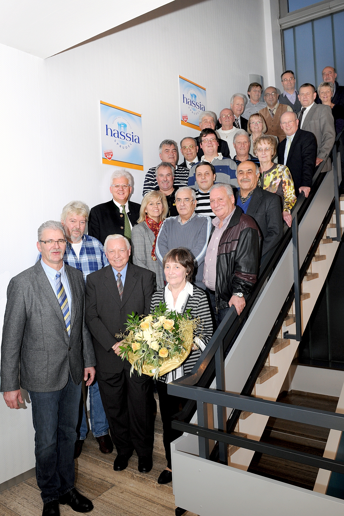 Dieses Mal wurden 75 Mitarbeiter geehrt – darunter 6 von Tochterunternehmen –, ein Drittel war zuvor bei Hessenquelle, Rosbacher oder in einem anderen Brunnenbetrieb tätig und nach der Fusion von Hassia übernommen worden.