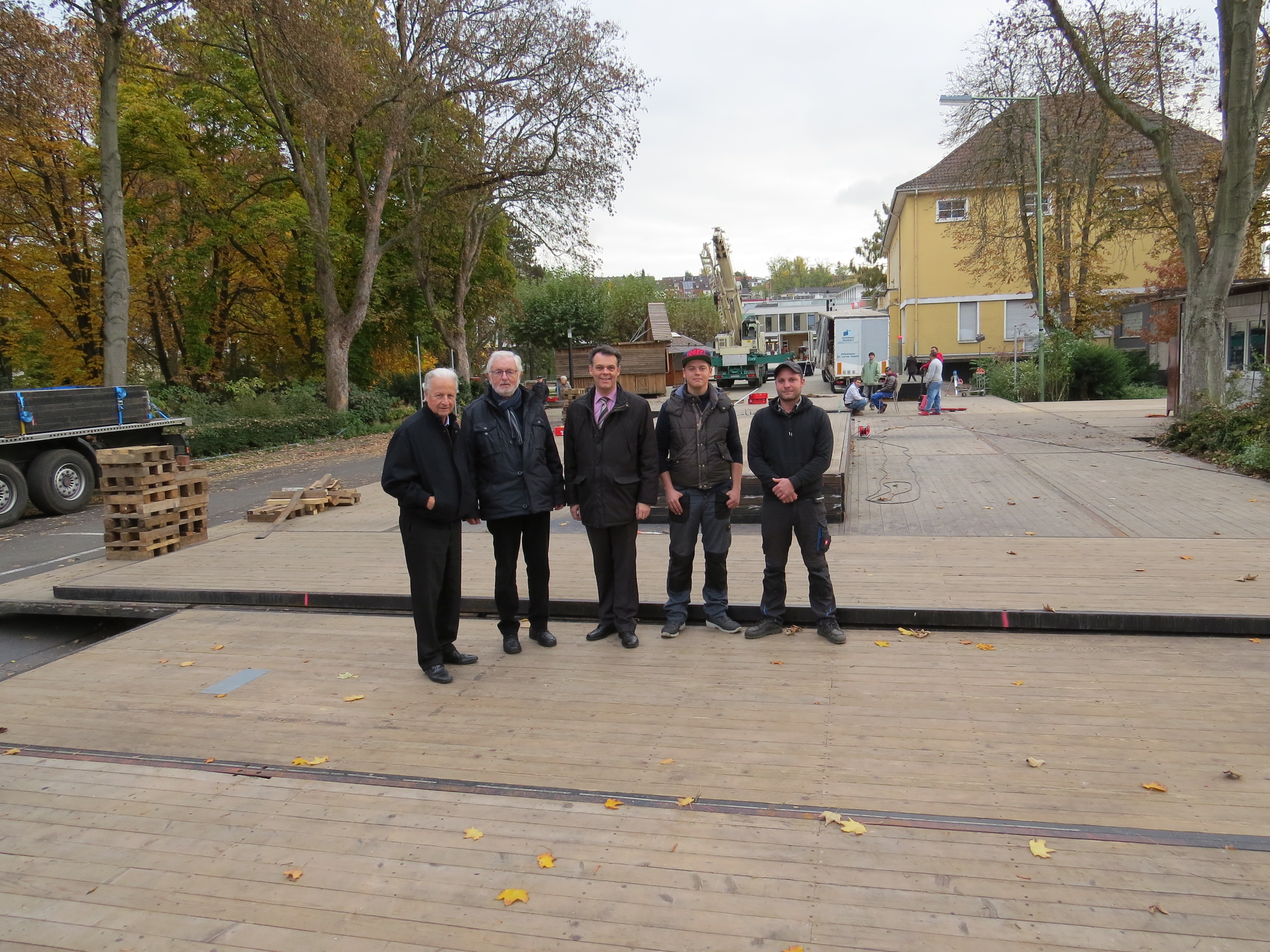 Hassia Seniorchef Günter Hinkel, Stadtmarketing-Manager Kurt Liebermeister, Bürgermeister Dr. Thomas Stöhr und die Betreiber Marcel Weinheimer (Gastronomie) und Mike Roie (Schausteller) besprechen den Aufbau vor Ort.