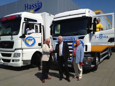 Eine langjährige Partnerschaft: (v.l.): Frank Franke (President Luftfahrt ohne Grenzen) dankt Ullrich Schweitzer (Marketing-Geschäftsführer HassiaGruppe) und wird gemeinsam mit Prof. Dr. Martin Börner (Vorstand Luftfahrt ohne Grenzen) den Lkw-Zug begleiten.