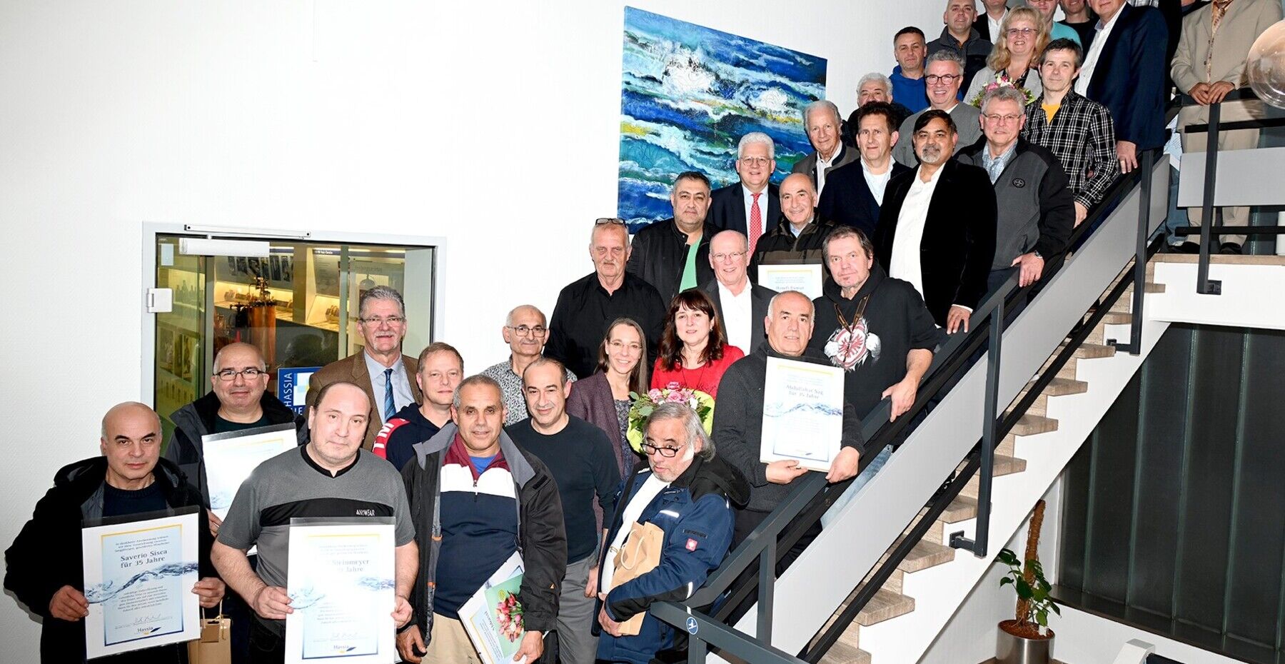 Darunter: Vertriebsgeschäftsführer Andreas Dietzel (obere Reihe, 4.ter von rechts) ist stolz auf 30 Jahre für Hassia Mineralquellen. Und Ralf Adler aus der Finanzbuchhaltung (obere Hälfte, rechts neben Günter Hinkel), konnte sein 45-jähriges Betriebsjubiläum feiern. Noch länger dabei ist nur Günter Hinkel. Der Hassia-Seniorchef feierte gerade erst seinen 85. Geburtstag. Jetzt freut er sich außerdem über sage und schreibe 60 Jahre Verantwortung für das Familienunternehmen.