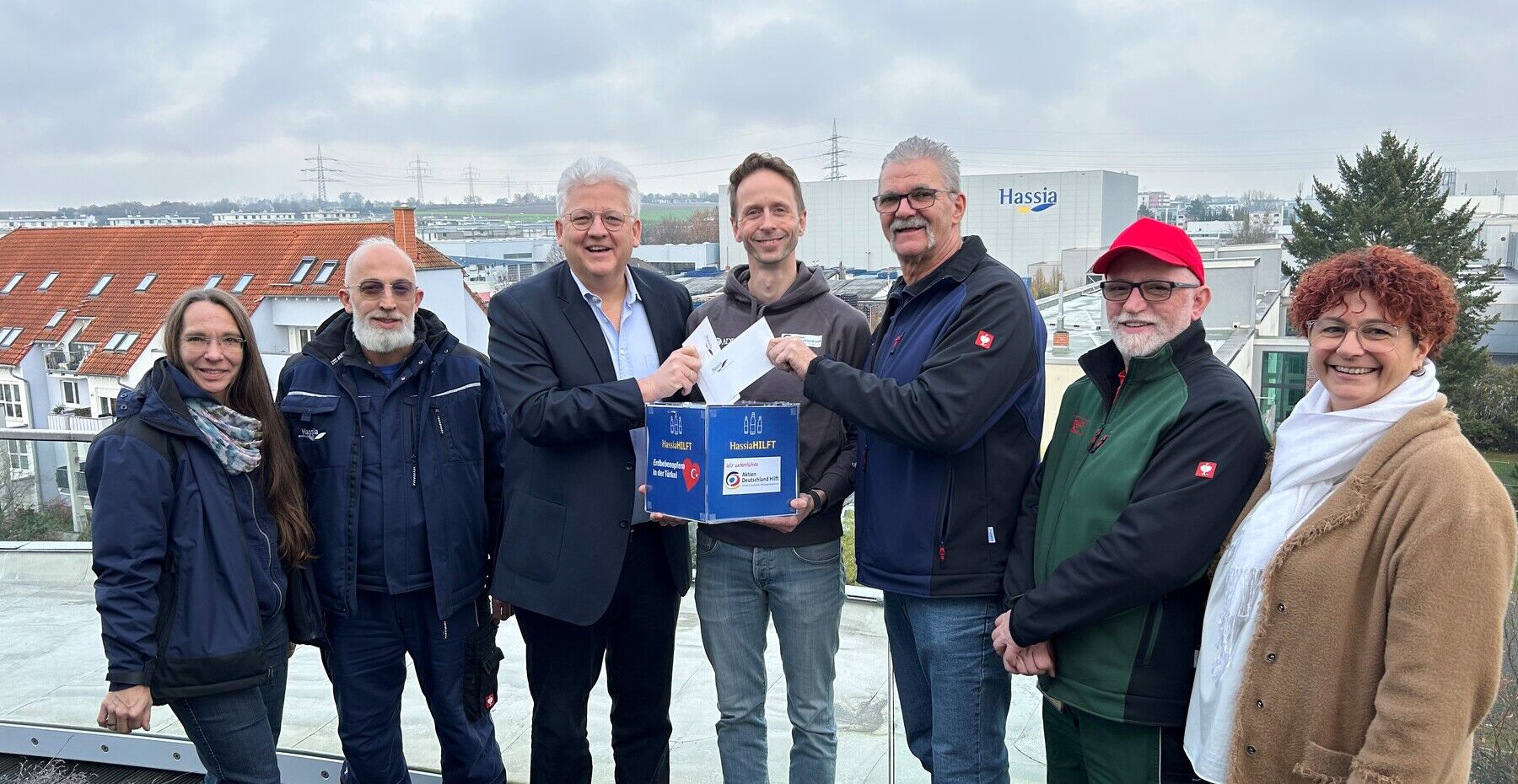 BU: Matthias Münz (Mitte) von „Aktion Deutschland hilft“ freut sich über die gemeinsame Spende von Hassia-Chef Dirk Hinkel (3ter v.l.) sowie den Mitarbeitern der HassiaGruppe, vertreten durch die Betriebsräte Andrea Seibert (v.l.n.r.), Hasan Karakelle, Betriebsratsvorsitzenden Thorsten Kurzan und seinen Rapps Kollegen Haci Yüce sowie Mercedes Lopes zugunsten der Erdbebenopfer in der Türkei und Syrien.