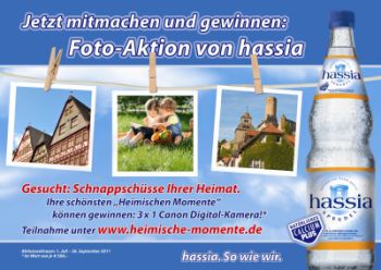 Jeder hat unter seinen Schnappschüssen seine Favoriten, seine ganz persönlichen Lieblingsbilder. Und wenn deren Motive auch noch aus der heimischen Region stammen, haben sie jetzt die Chance, nicht nur veröffentlicht, sondern auch noch prämiert zu werden. Denn seit 01. Juli lädt der große Foto-Wettbewerb „Heimische Momente“ von hassia Mineralwasser alle Verbraucher ein, ihre persönlich schönsten heimischen Fotoimpressionen einzusenden.