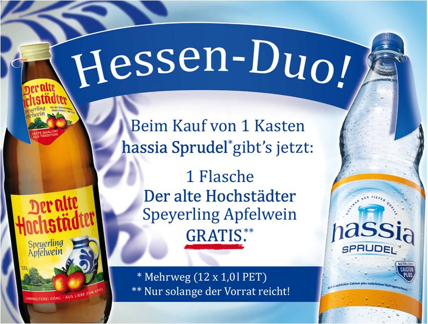 Deshalb setzt hassia die sehr erfolgreiche Zugabeaktion aus dem Jubiläumsjahr 2014 fort: Unter dem Titel Hessen-Duo gibt es bis Ende Mai beim Kauf von 1 Kasten hassia Sprudel mit 12 x 1,0 Liter im PET-Mehrweggebinde 1 Flasche Der alte Hochstädter gratis dazu, so lange der Vorrat reicht*. Als spritziges „Hessen-Duo“ eröffnen der Speyerling-Apfelwein der Landkelterei Höhl und hassia Sprudel somit bereits im April die „Stöffche“-Saison.