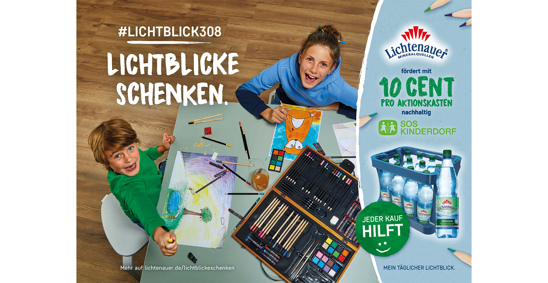Aufmerksam macht Lichtenauer auf seine Aktion „Lichtblicke schenken“ im Handel über Aktionskästen mit Lichtenauer Mineralwasser. Von jedem verkauften Aktionskasten kommen zudem 10 Cent den Projekten des SOS-Kinderdorf e.V. zugute. Darüber hinaus gibt es eine Verlosung von Malsets am POS. Plakate, Station Videos und Radiospots bewerben die Aktion reichweitenstark in der Vertriebsregion.