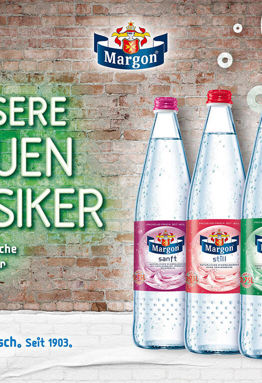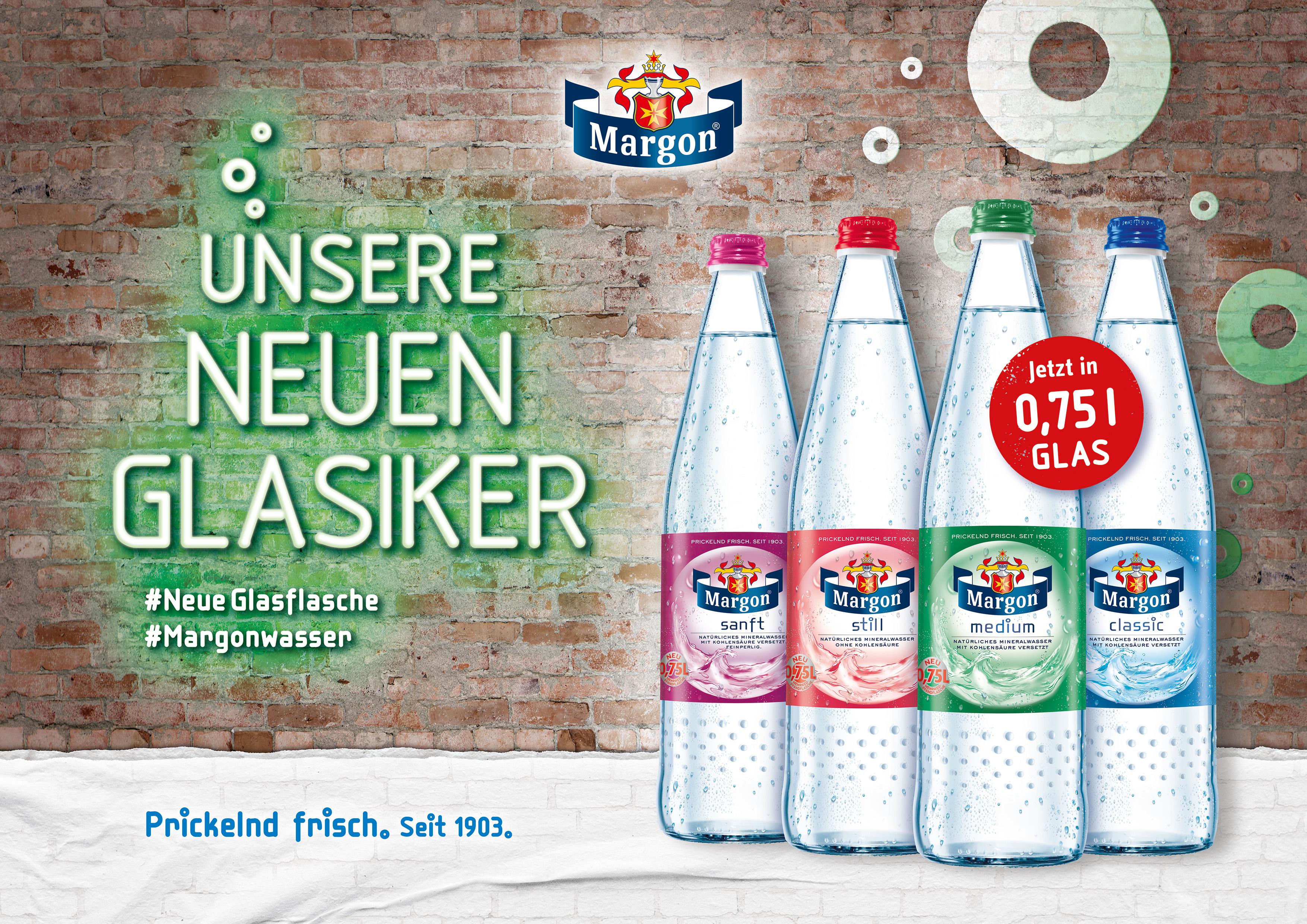 Ab sofort prickelt Margonwasser in einer neuen, eleganten Perlenflasche: Die Sorten Margon Classic, Medium, Sanft und Still sind ab sofort auch im attraktiven 12 x 0,75 Liter Glas-Mehrweggebinde (N2) der Genossenschaft Deutscher Brunnen (GDB) erhältlich.