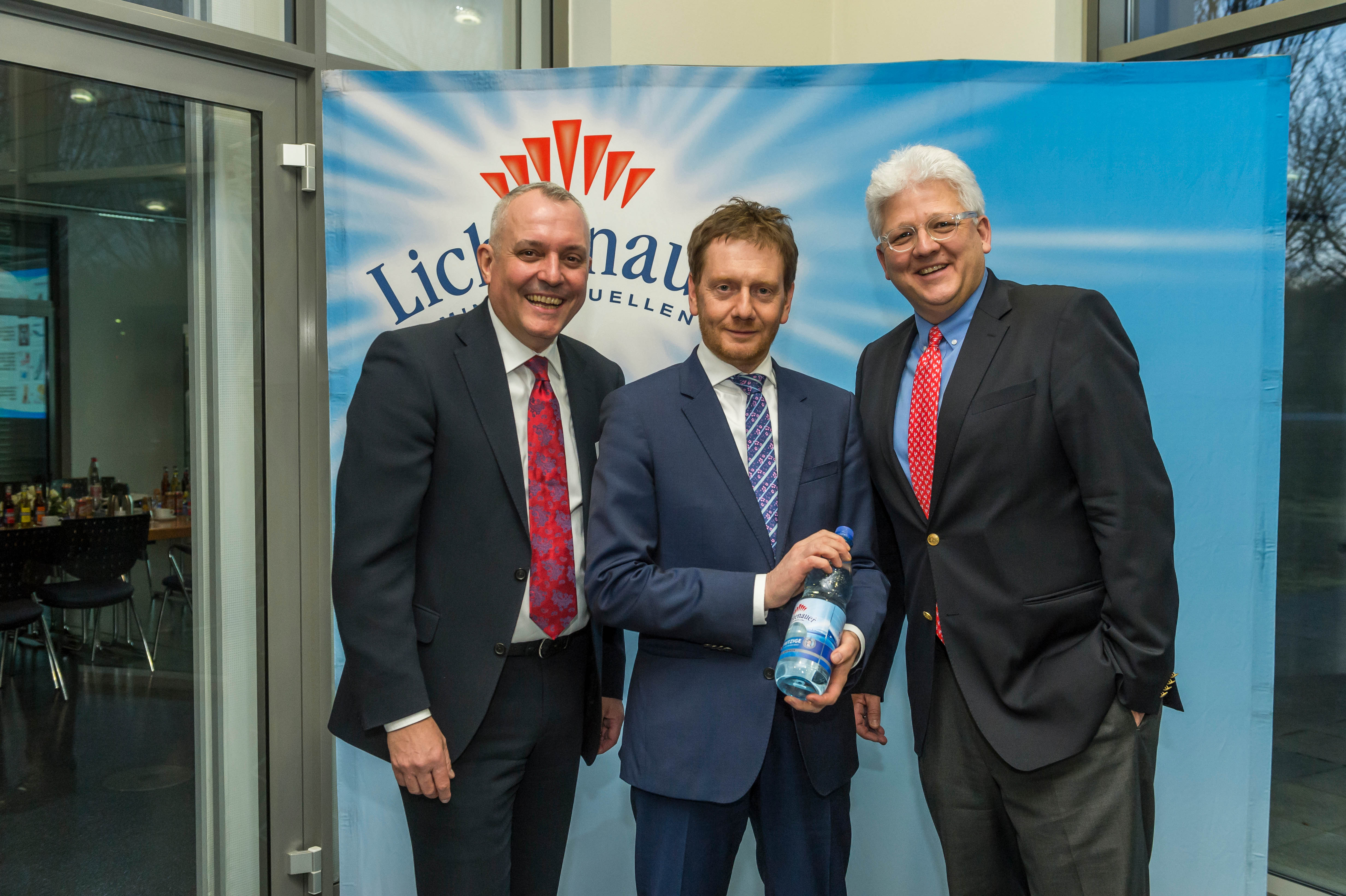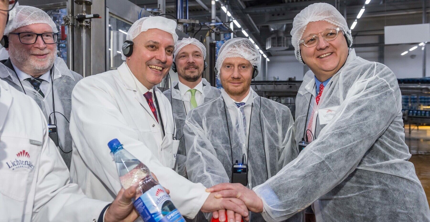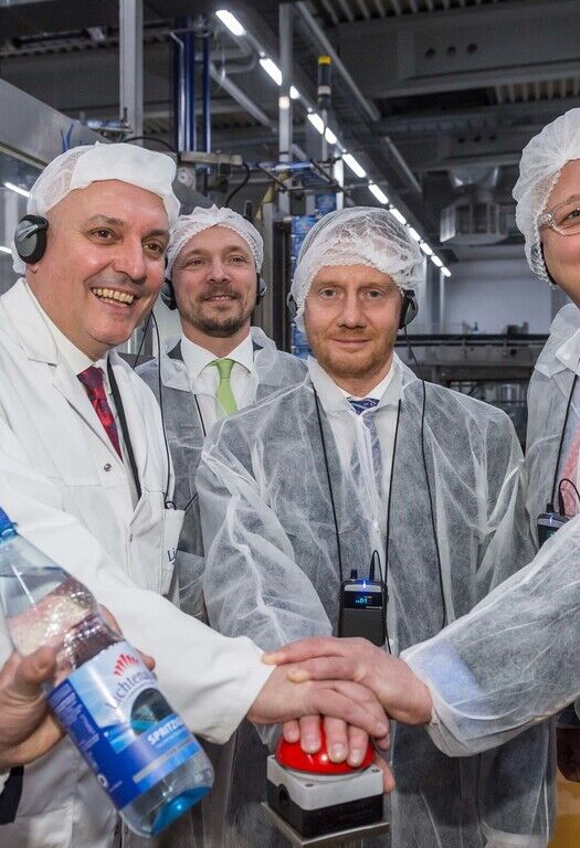 Am Donnerstag begrüßten die Lichtenauer Mineralquellen den neuen sächsischen Ministerpräsidenten Michael Kretschmer (CDU) gemeinsam mit weiteren Vertretern der Landes- und Lokalpolitik im Unternehmen in Lichtenau. Anlass des Besuchs war die Abfüllung der viermilliardsten Lichtenauer-Flasche nach einem erfolgreichen Jahr 2017 beim sächsischen Mineralbrunnenunternehmen. Hierzu waren neben dem Regierungschef auch MdB Marco Wanderwitz (CDU), Landrat Matthias Damm (CDU), Landtagsabgeordnete Iris Firmenich (CDU) sowie die Bürgermeister Andreas Graf (CDU) aus Lichtenau und Thomas Firmenich (CDU) aus Frankenberg der Einladung von Dirk Hinkel, Geschäftsführender Gesellschafter der Lichtenauer Mineralquellen GmbH, und Paul K. Korn, Geschäftsführer, gefolgt.