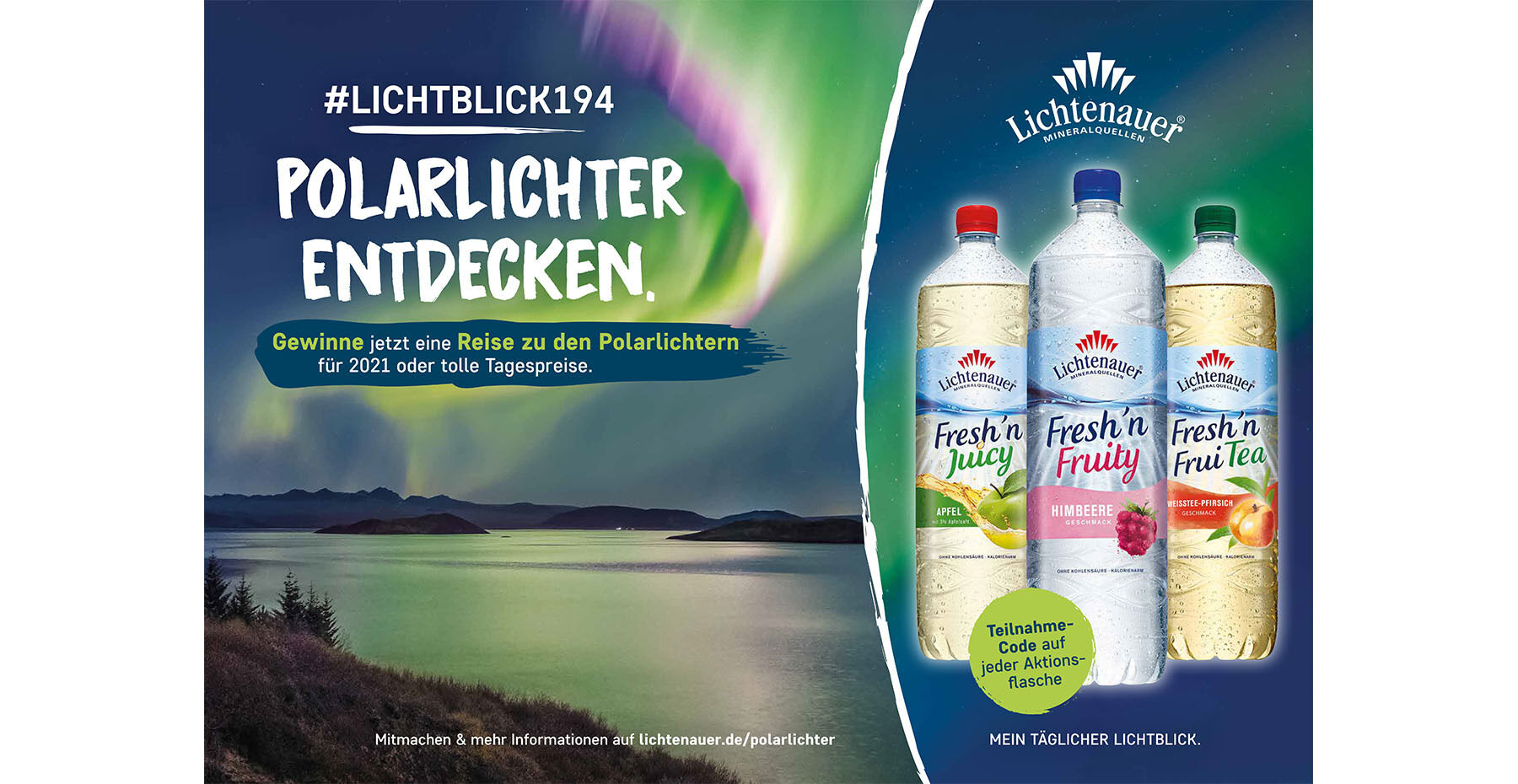 Die Sonne lacht, die Temperaturen steigen und die Urlaubszeit steht bevor. Doch dieser Sommer wird anders als die vergangenen. Abstandsregeln, Mundschutz, Kontaktbeschränkungen und weniger bis gar keine Urlaubsreisen. Gerade in diesem Jahr fallen die langersehnten Urlaube bei den Meisten anders aus als ursprünglich geplant. Lichtenauer schafft in dieser Zeit den notwendigen Lichtblick und verlost neben hochwertigen Tagespreisen eine Reise für zwei Personen zu den Polarlichtern. Die Glückscodes befinden sich auf Lichtenauer Fresh'n-Getränken mit dem Aktionsetikett "Polarlichter entdecken".