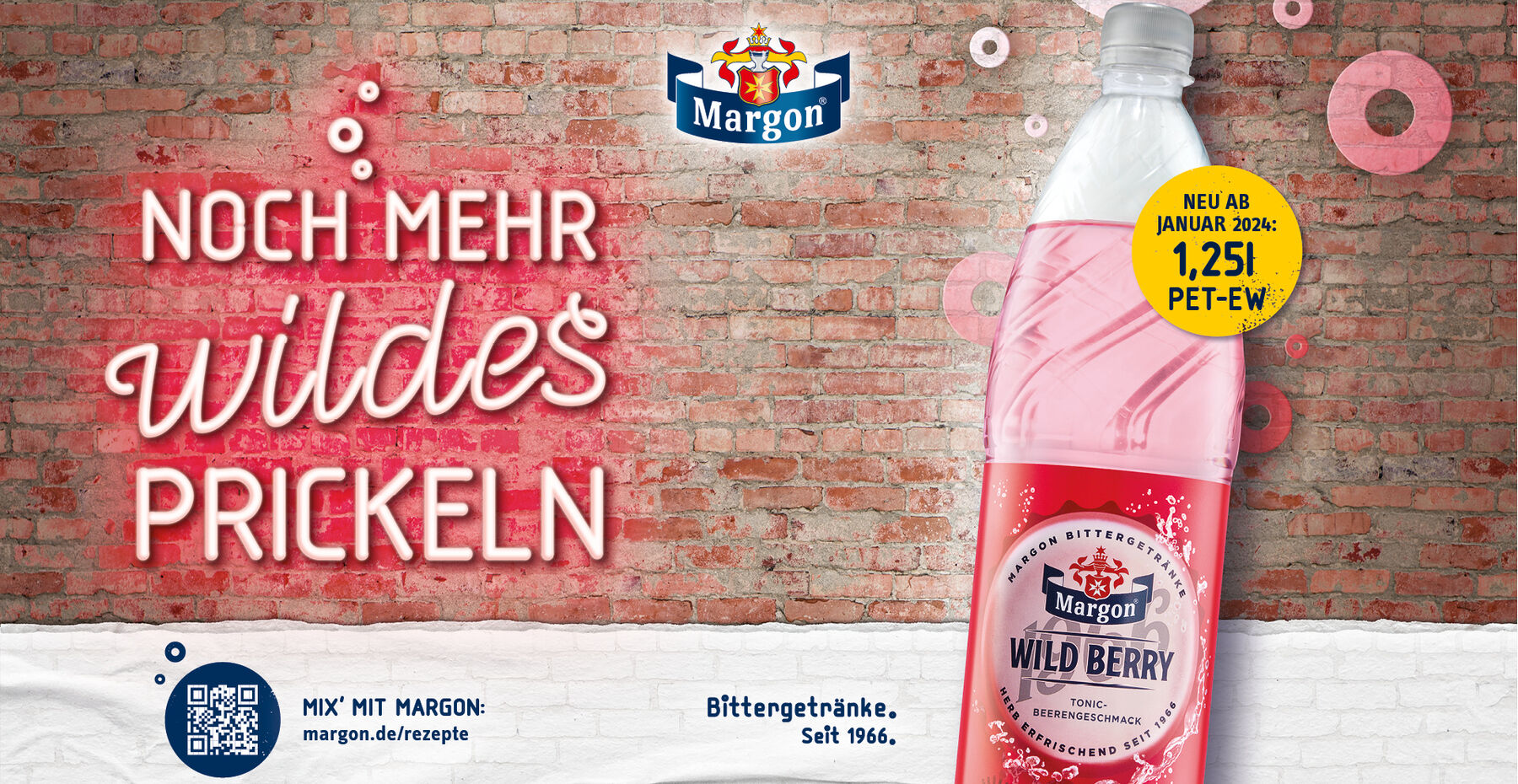 Für seine neueste Sorte Wild Berry aus der beliebten Bittergetränke-Range erweitert die sächsische Marke Margon ihr Gebindeangebot: Seit diesem Jahr ist Margon Wild Berry auch in der 1,25 Liter PET-Einwegflasche erhältlich und reiht sich mit diesem Gebinde neben dem bewährten Trio Bitter Lemon, Tonic Water und Ginger Ale ein.