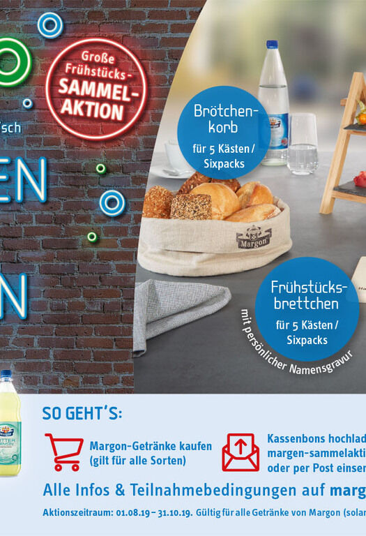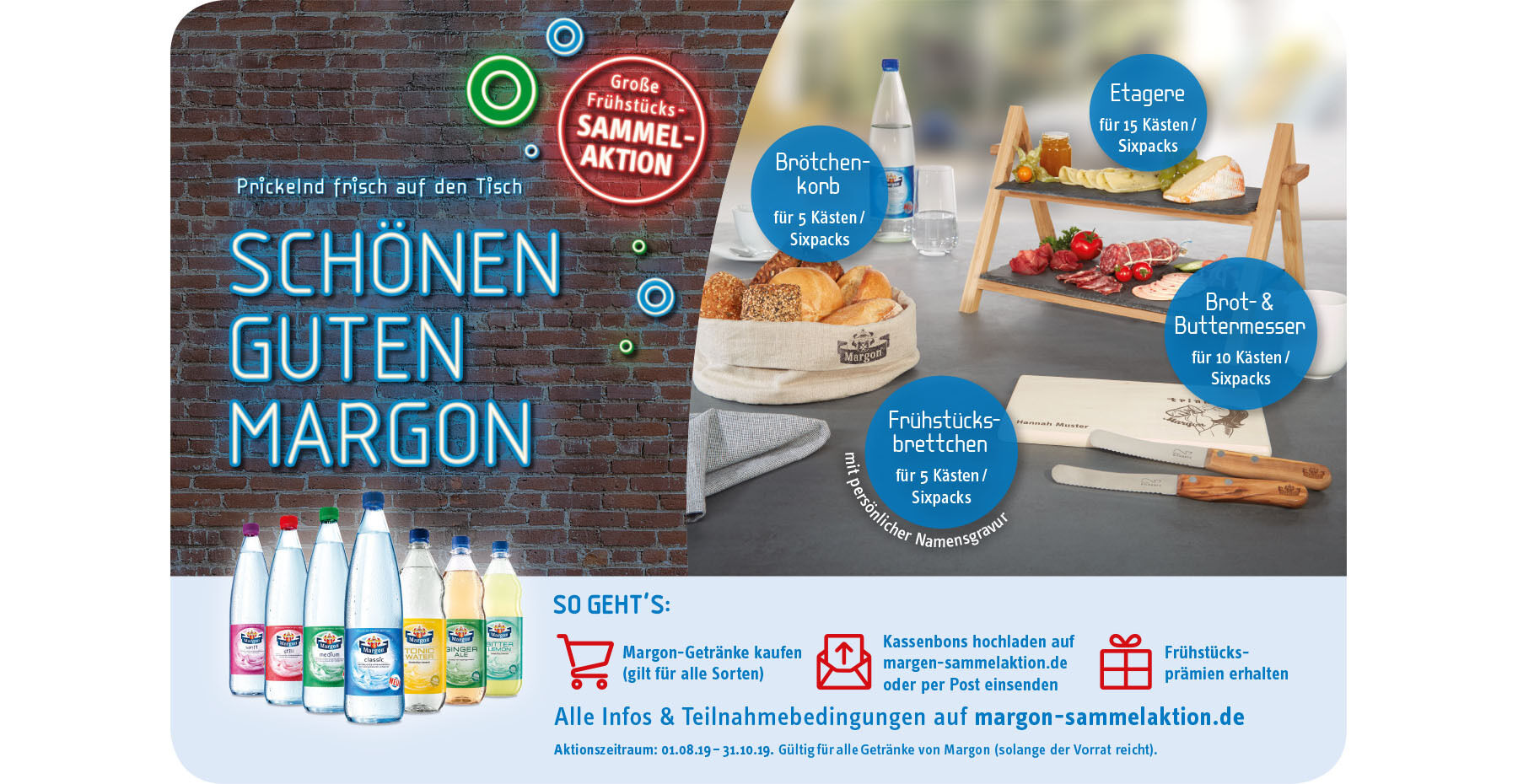 Schon für fünf Getränkekästen oder Sixpacks können Margon-Kunden zwischen einem Brotkörbchen aus Leinen oder zwei Frühstücksbrettchen mit individueller Namensgravur wählen. Ab zehn Getränkekästen oder Sixpacks gibt es ein 2er-Set Brot- und Buttermesser und Verbraucher, die 15 Kästen oder Sixpacks vorweisen können, erhalten eine Etagère im modernen Look aus Bambus und Schieferplatten. „Die hochwertigen Prämien für den Frühstückstisch unterstreichen noch einmal unsere Margon-Kampagne zum Thema Tischkultur für unsere neuen 1,0-Liter-Glas-Individualflaschen und damit auch die Qualität unserer Produkte“, berichtet Markenmanagerin Susan Mattausch.