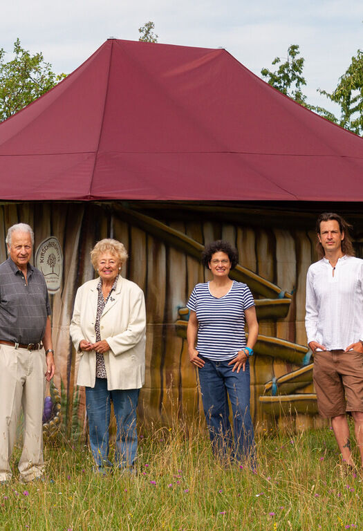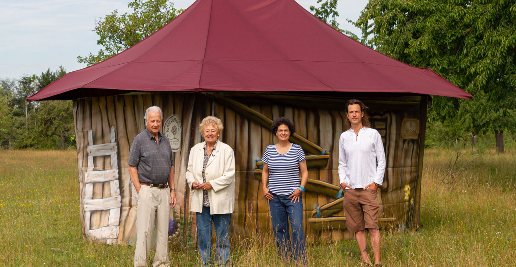 Damit Ausflüge auf die Wiesen nicht wegen Regen ins Wasser fallen müssen, hat Hassia ein hochwertiges Pavillonzelt gespendet. Bis zu 25 Kinder finden darin Platz. Weil die Errichtung einer ursprünglich als Unterschlupf gedachten festen Holzhütte aus Naturschutzgründen nicht möglich ist, hat der Graffiti-Künstler Sebastian Stehr den Pavillon im Holzlook gestaltet. Neben Äpfeln und Pflaumen finden sich an den Wänden auch Kirschbaumelemente, ebenso wie das für das Gedeihen einer Streuobstwiese nötige Wasser. „So haben wir doch noch unsere namensgebende Kirschberghütte bekommen. Dass sie mobil ist und wir sie ganz nach Bedarf an verschiedenen Orten aufstellen können, ist sogar ein Vorteil“, freut sich Tanja Tahmassebi-Hack.