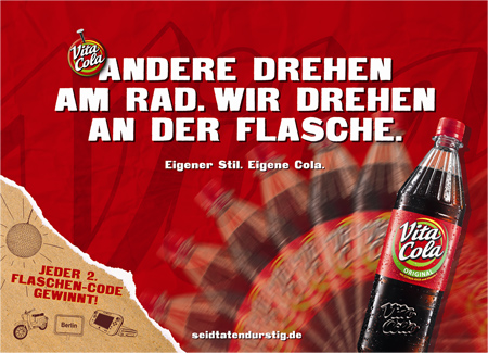 Schmalkalden/Lichtenau, März 2013. „Andere drehen am Rad. Wir drehen an der Flasche.“ – unter diesem Motto startet in der 13. Kalenderwoche (ab 25. März) die Major Consumer Promotion 2013 der Marke VITA COLA. Auf vier Millionen 1,0 l PET-Mehrwegflaschen der Cola-Sorten Original und Pur sowie der Limonaden Orange und Exotic finden sich dann Spielcodes. Die können VITA COLA-Fans bis 30. Juni unter www.seidtatendurstig.de eingeben und damit eine virtuelle VITA COLA-Flasche zum Drehen bringen. Jeder zweite Code gewinnt, zum Beispiel einen von fünf restaurierten Original-Motorrollern der Marke Schwalbe, eine von fünf Berlin-Reisen für zwei Personen oder einen Einkaufsgutschein. Zum krönenden Abschluss verlost VITA COLA unter allen registrierten Flaschendrehern eine Party im Wert von 5.000 Euro.