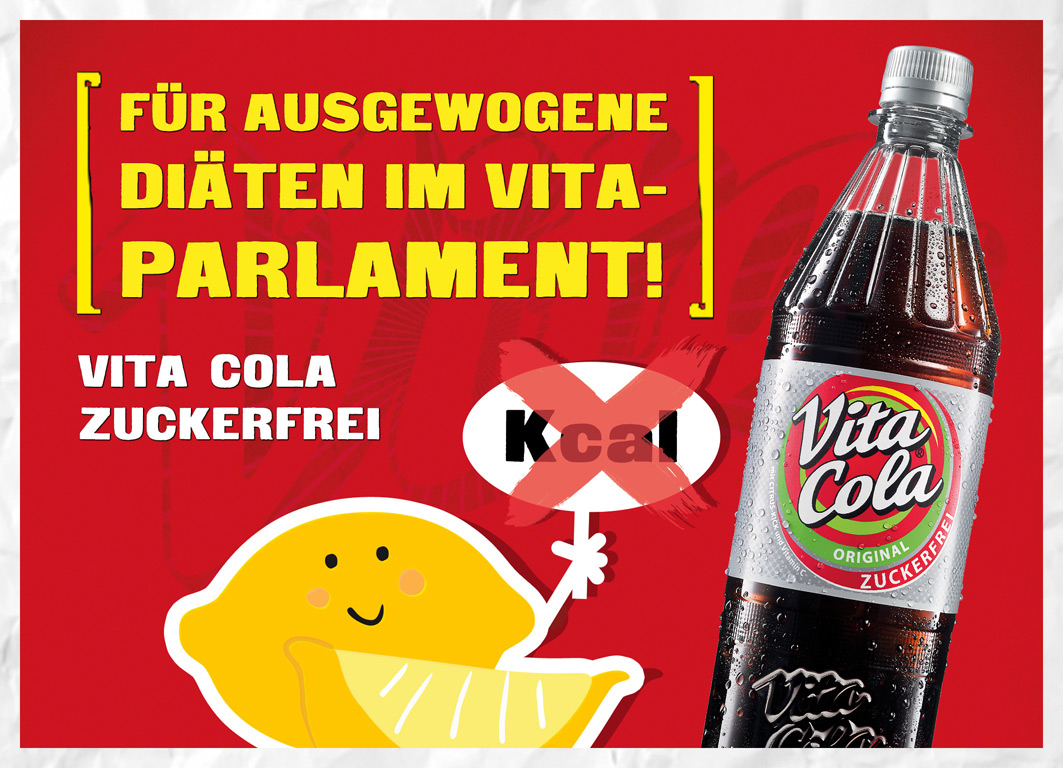 Schmalkalden/Lichtenau, 2. September 2013. Noch bis zum 22.9.2013 stellen sich alle VITA COLA Getränke zur VITA-Wahl. Unter vita-cola.de wirbt jedes Produkt mit einem Wahlplakat für sich. So fordert die VITA COLA Zuckerfrei beispielsweise ausgewogene Diäten im Parlament. Wer Fragen beantwortet, erhält ähnlich dem echten Wahl-O-Mat eine Wahlempfehlung in puncto Erfrischungsgetränk.