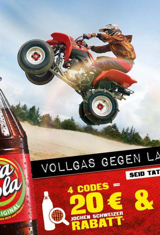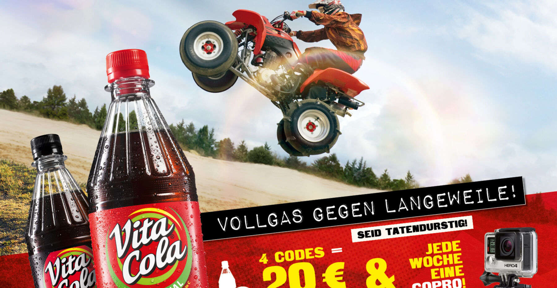 Schmalkalden/Lichtenau, 30. März 2016. House-Running, Base-Flying, Offroad-Quad: Die junge, tatendurstige Zielgruppe von VITA COLA liebt solche außergewöhnlichen Kicks. Mit der VITA COLA Consumer Promotion 2016 können sich die Fans deshalb direkt ins Abenteuer stürzen. Unter dem Motto „Vollgas gegen Langeweile“ verlost die ostdeutsche Kultcola zwischen Mitte April und Ende Juni in umfangreichen Online- und POS-Aktionen Abenteuerpakete von Jochen Schweizer sowie Actionkameras. So lässt sich Spaß erleben, filmen und – ebenso wichtig wie das Abenteuer selbst – im Netz mit Freunden teilen.