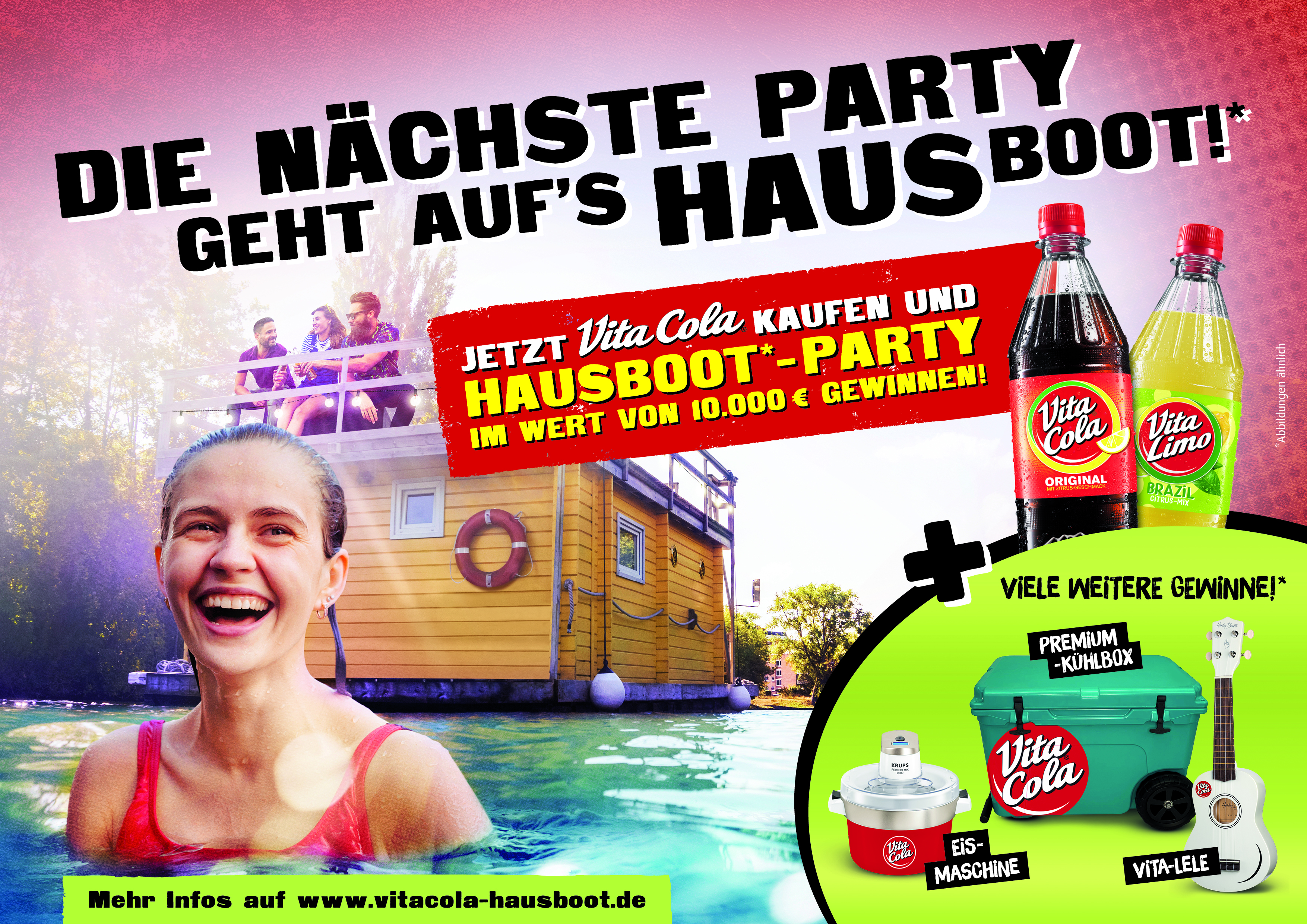 Die dreimonatige VITA COLA Consumer Promotion 2022 lockt mit sommerlichen Preisen. Der Hauptgewinn ist ein Hausboot-Urlaub im Wert von 10.000 Euro.