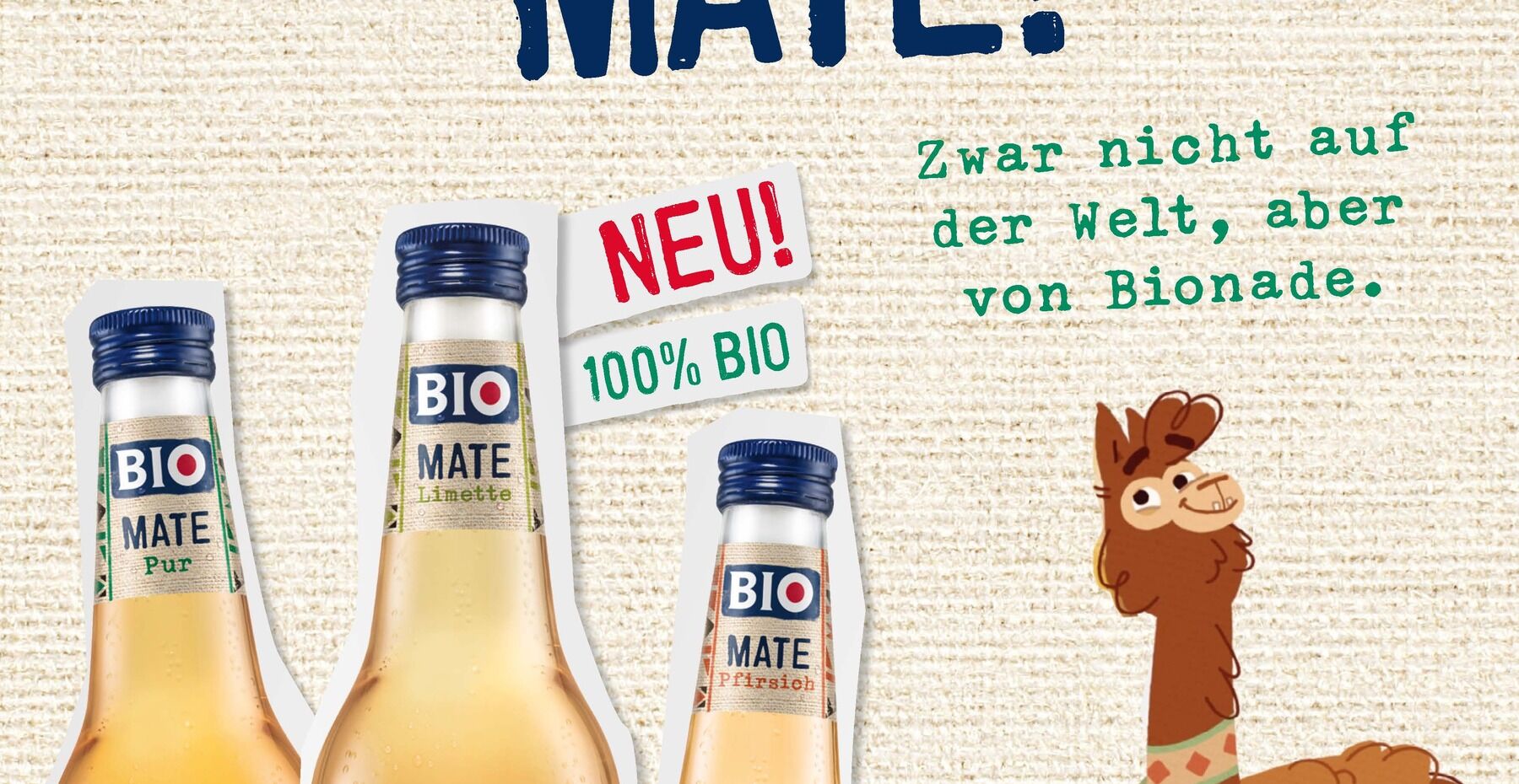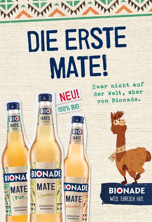 Mit Stilelementen, die an den südamerikanischen Ursprung von Mate erinnern, wie die farbenfrohen Muster sowie dem illustrierten Alpaka präsentiert sich die BIONADE Mate Kampagne in drei Zehn-Sekunden-Spots und mit Bannern auf digitalen Kanälen. Eine Plakatkampagne im Umfeld von Hochschulstandorten und vor Verbrauchermärkten rundet den Auftritt ab. Am POS macht BIONADE Mate mit einem Gewinnspiel auf sich aufmerksam, bei dem es Alpakawanderungen mit Hotelübernachtung zu gewinnen gibt.
